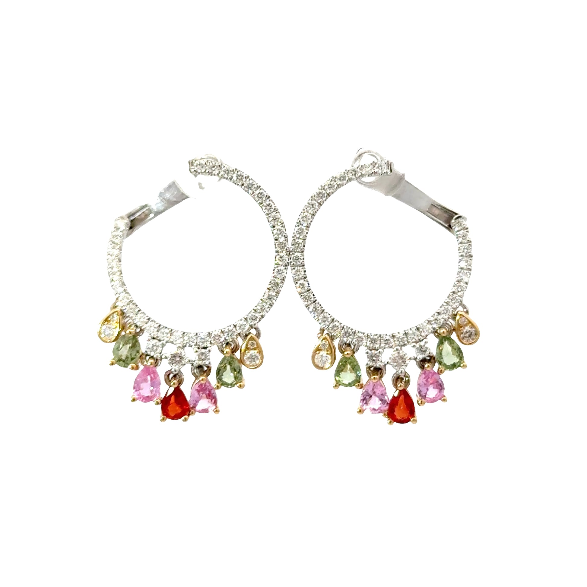 Enhance your jewelry collection with these charming 14K white gold sideways hoop earrings. Delicately crafted, these earrings feature Natural round brilliant cut diamonds totaling 0.99 carats that offer exceptional sparkle. Adding a pop of color are the Natural pear shaped colorful sapphires totaling 2.19 carats, completing the design with a touch of playful elegance. A perfect accessory for both day and evening wear.