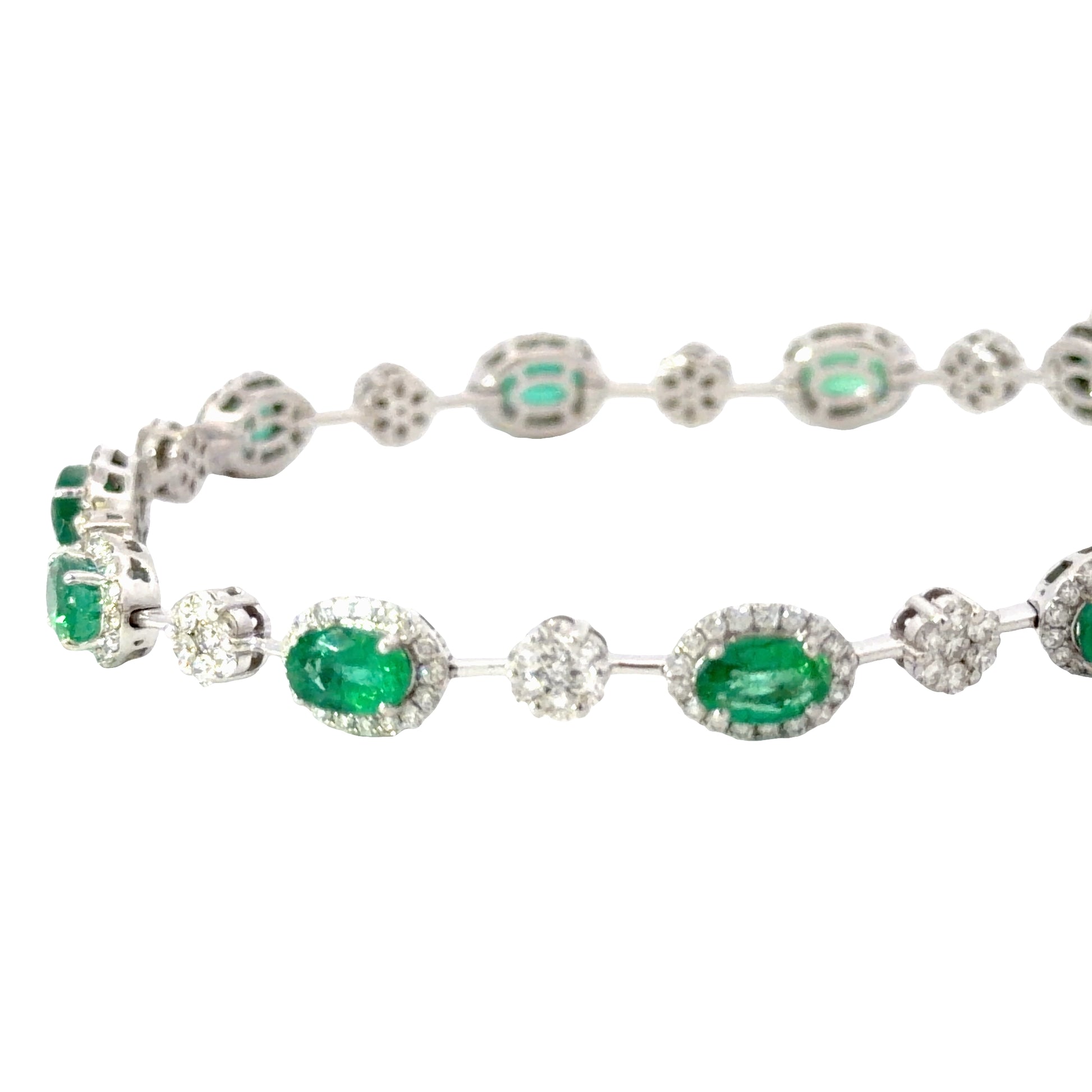 Indulge in timeless elegance with this exquisite 18K white gold tennis bracelet. The captivating design features a series of meticulously set, Natural oval shaped emeralds totaling 5.28 carats and natural diamonds total 2.00 carats. The vivid green emeralds are gracefully arranged, creating a harmonious balance between luxury and refined style. A stunning statement piece, perfect for adding a touch of sophistication to any ensemble.