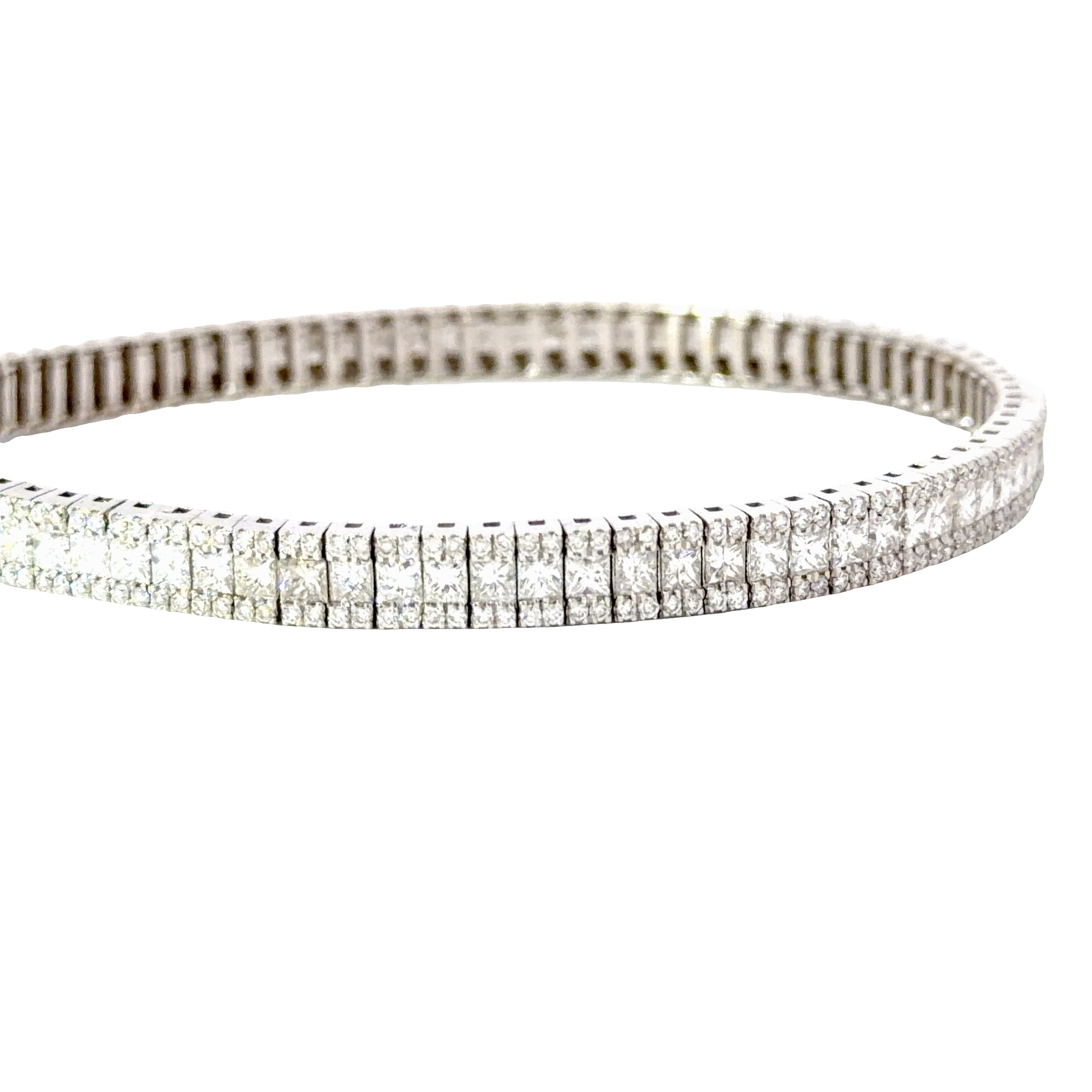 Indulge in timeless sophistication with this exquisite 18K white gold tennis bracelet. Showcasing a continuous line of meticulously set of Natural princess and round cut diamonds totaling 6.08 carats, each stone is expertly cut to maximize its brilliance and fire. With its classic design and exceptional craftsmanship, this bracelet exudes elegance and refinement, making it the perfect accessory for any occasion.