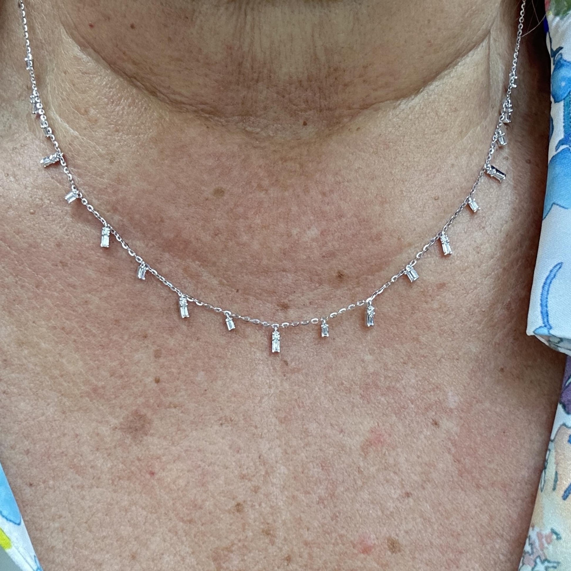 A baguette diamond necklace is a classic and timeless piece that will never go out of style. This necklace features a total of 0.31ct diamonds set in a diagonal pattern. It's a beautiful piece that will make any outfit stand out.