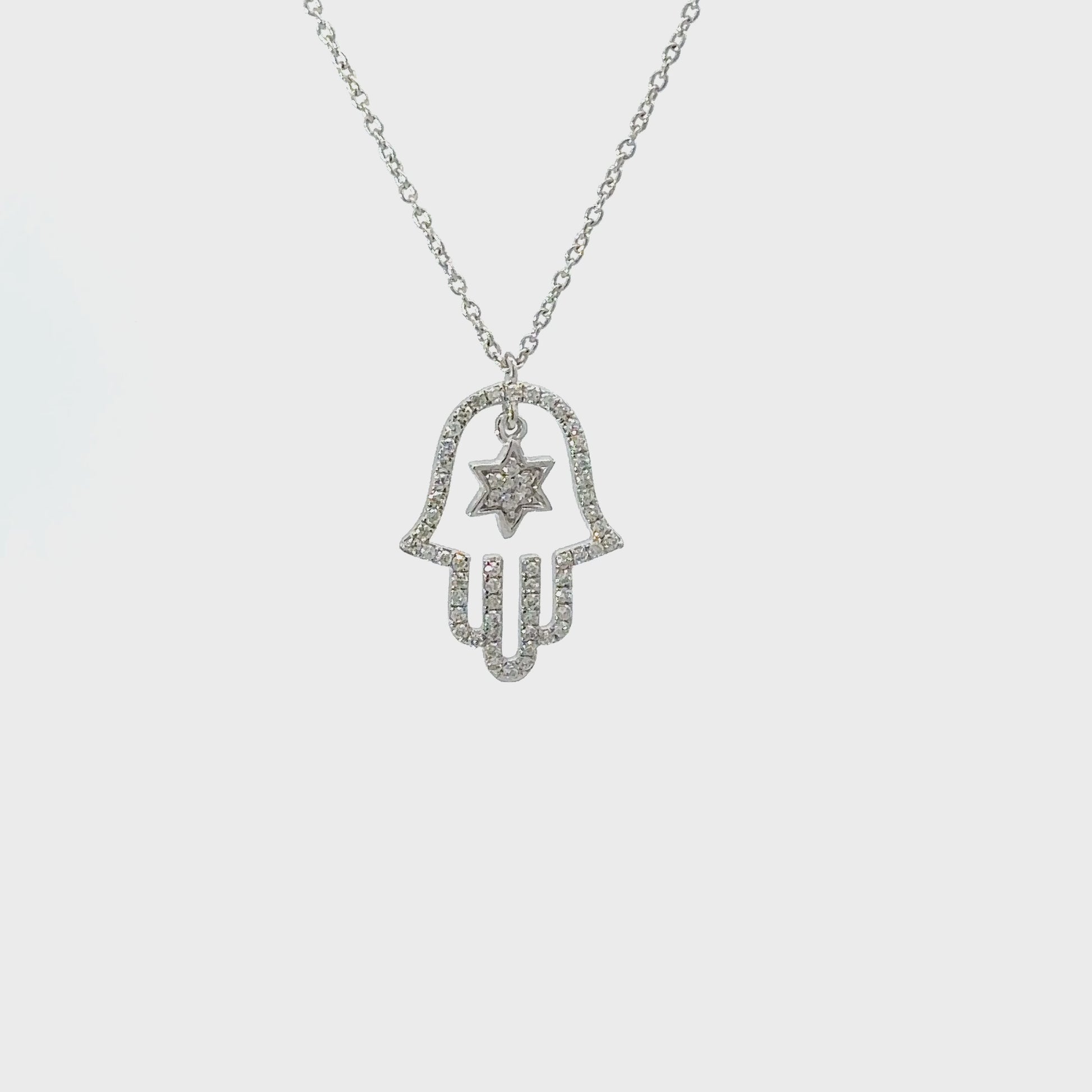 This elegant hamsa necklace features a hamsa hand pendant with a star of david design and a total of 0.20ct diamonds. The delicate hamsa hand pendant is made of 18K gold, and the 0.20ct diamonds are prong-set for ultimate brilliance and sparkle. This is a perfect piece to express your warm affection to someone special.