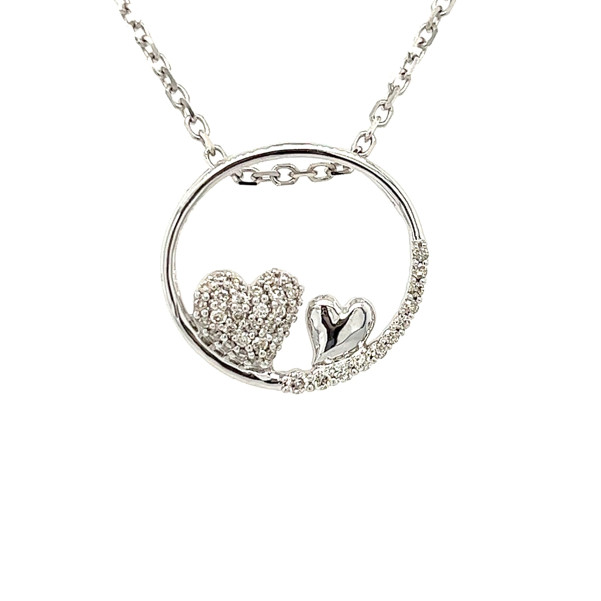 This trendy minimalist necklace features a 0.25ct round brilliant diamond set in 14K white gold. A double heart is set inside a circle design that is meant to symbolize togetherness and the circle represents eternity. The 14K white gold chain length is 16 inches, but it can be adjusted to 18 inches with the free extender. The total diamond weight is 0.5ct.