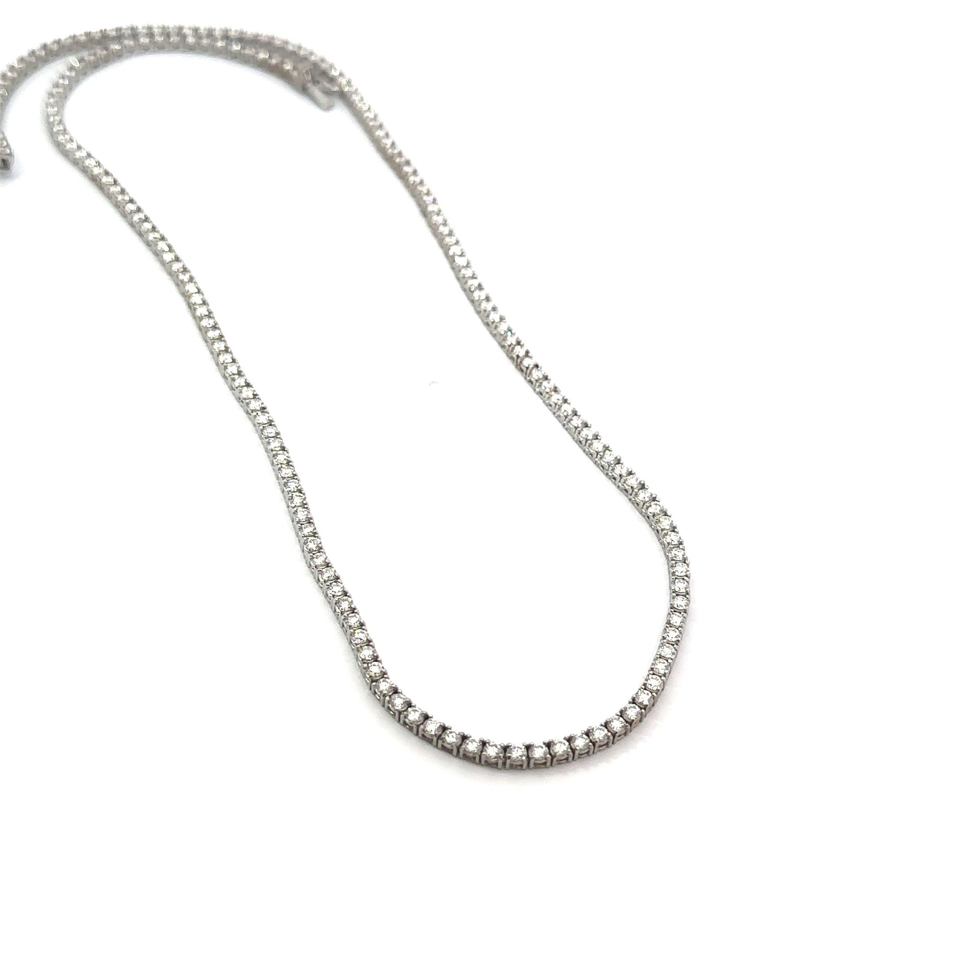 This beautiful tennis necklace features a shared prong design that is simple, yet elegant. The elegant diamond design is set in 18K white gold and is crafted with total of 9.50ct diamonds. An excellent gift for the tennis lover, this is a piece that is perfect for all seasons.