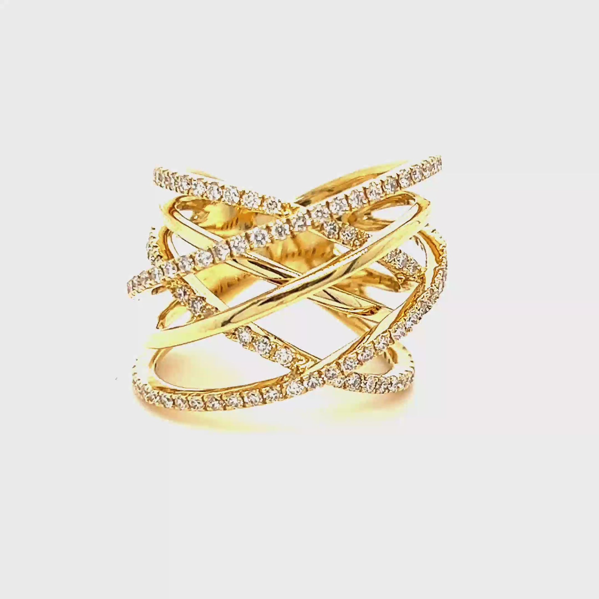 Diamonds are forever. And so are the sentiments on this criss cross style diamond band. It is made from 18k yellow gold material, set with a 1.11ct round diamonds, and finished with high polished edges. The diamonds are hand-picked to match the color and clarity of the diamond.