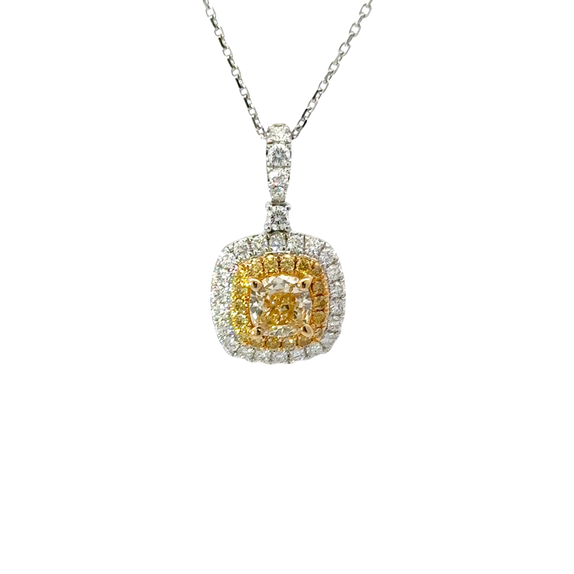 This stunning GIA Fancy light yellow Cushion 1.03 carats diamond pendant is a true statement piece. Set in 18K white and yellow gold with double halo of white and yellow diamonds totaling 0.59 carats, the intricate design is perfect for any occasion.