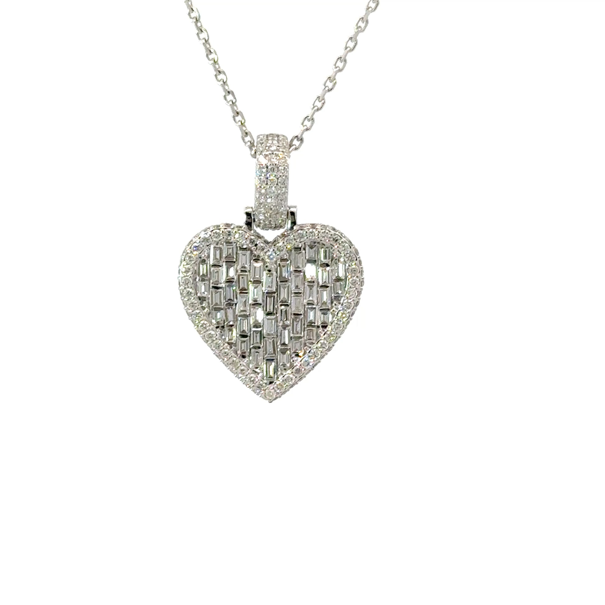 This exquisite heart-shaped pendant is a masterpiece of elegance and sophistication. Crafted with precision, it features a stunning array of shimmering natural diamonds totaling 1.04 carats that catch the light beautifully. Perfect for adding a touch of romance to any outfit, this pendant is a timeless piece that will be cherished for years to come. Made in 18K white gold on a 18" chain.