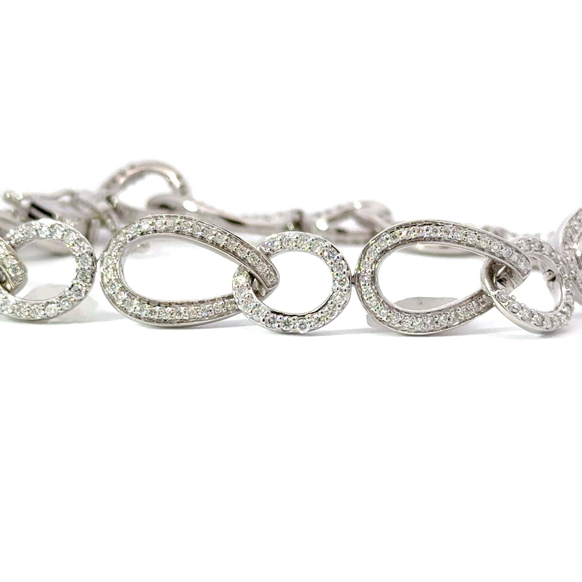 This exquisite 18K white gold bracelet features interlocking loops adorned with 2.18 carats of natural sparkling diamonds. The intricate design and high-quality craftsmanship make it a perfect accessory for any elegant occasion.