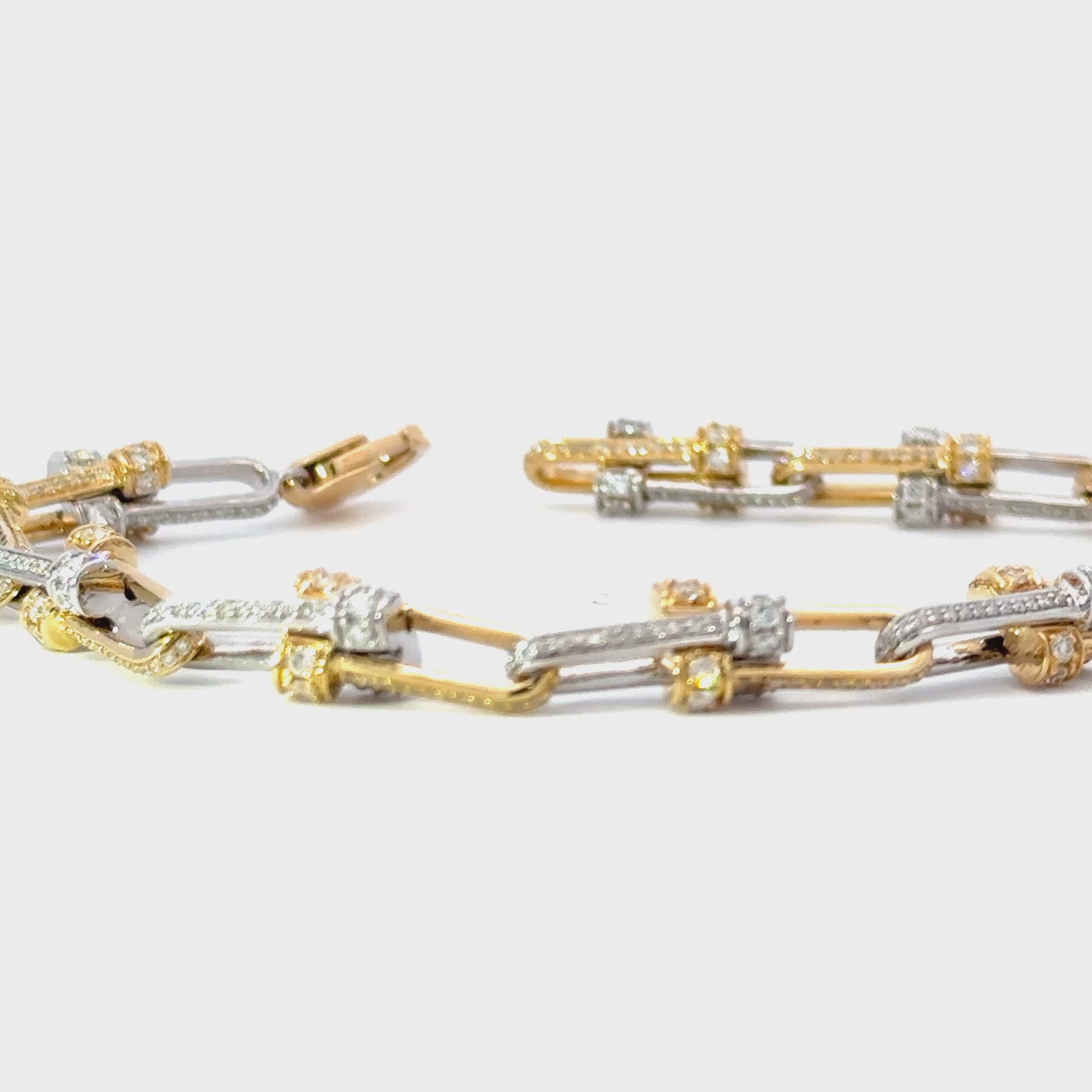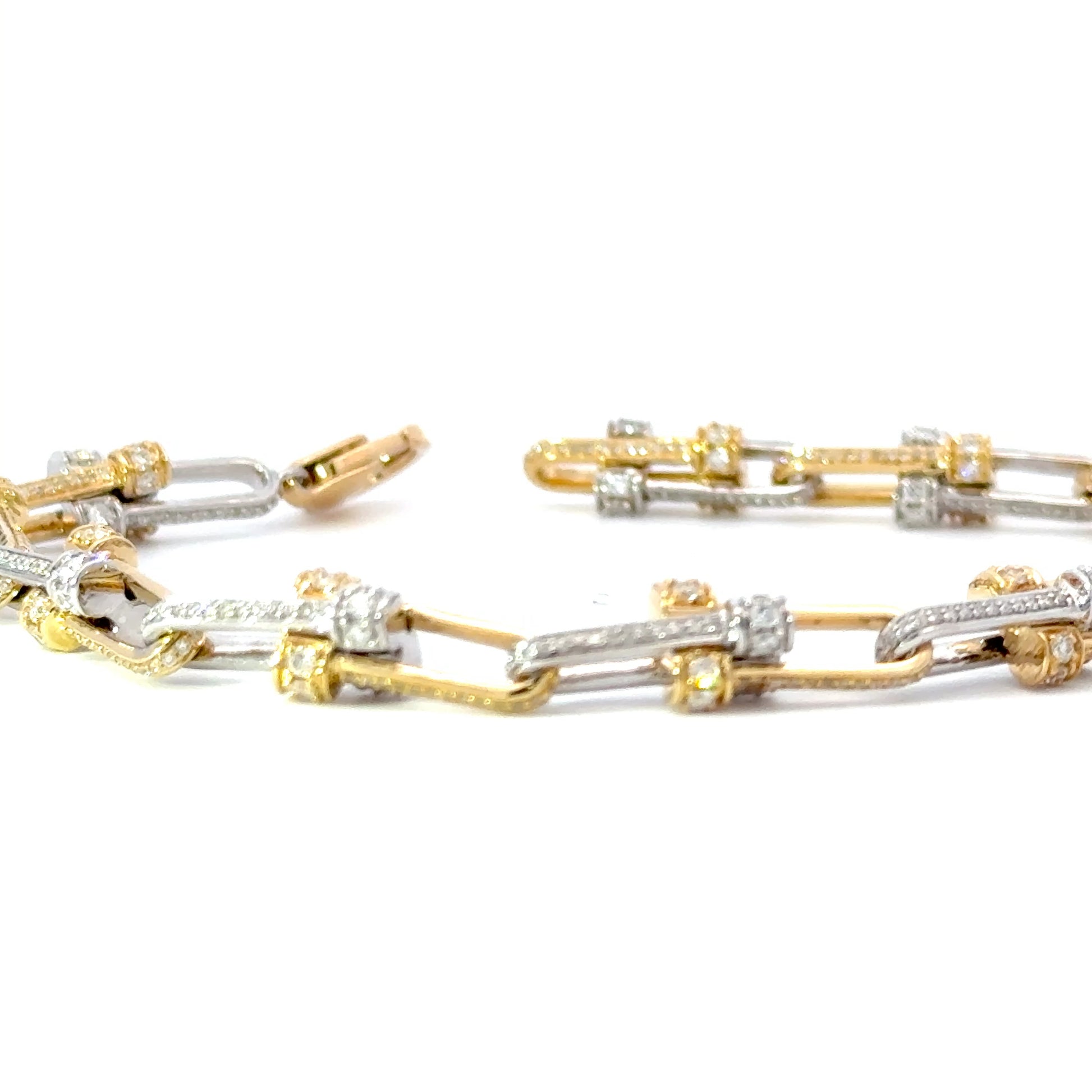 This exquisite two-tone 18K white and yellow gold chain bracelet features a harmonious intricate designed links creating a stunning visual contrast. Each link is meticulously crafted to ensure durability while maintaining an elegant appearance. Perfect for both casual and formal occasions, this bracelet adds a touch of sophistication to any outfit. Pave with natural diamonds totaling 2.45 carats.