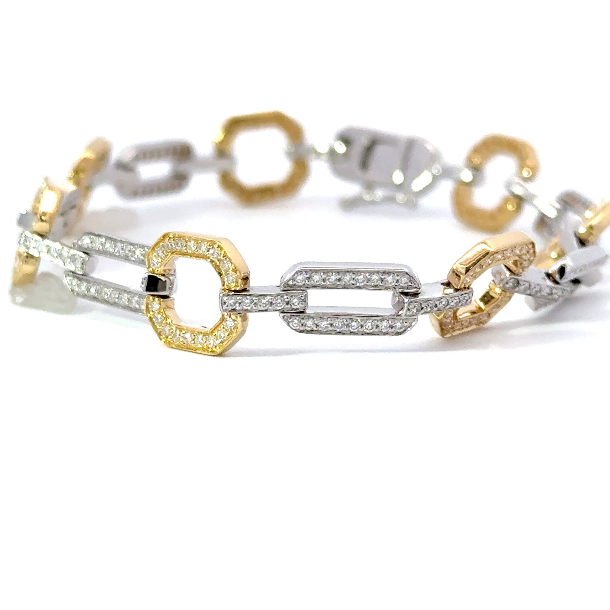 This exquisite bracelet features a stunning two-tone design with alternating 18K yellow and white gold links. Each link is meticulously adorned with total weight 1.70 carats of natural sparkling diamonds, creating a luxurious and sophisticated look. Perfect for any occasion, this bracelet adds a touch of elegance to your ensemble.