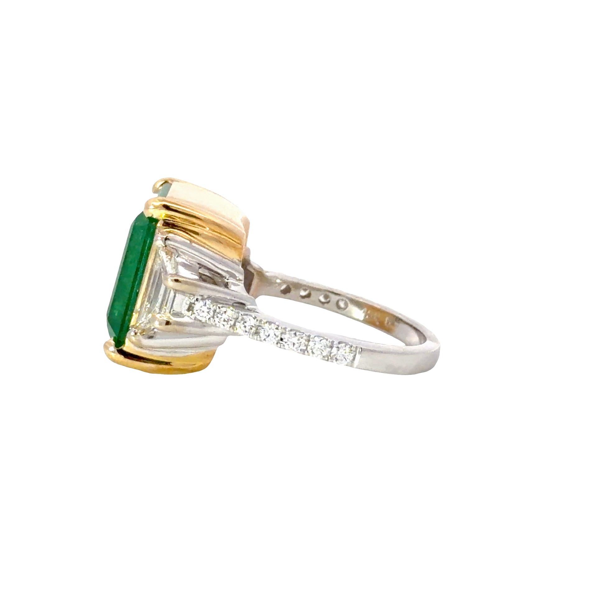 Exquisite 18K yellow gold ring featuring a captivating GIA Natural emerald-cut emerald 9.63 carats as its centerpiece. Set with natural trapezoid diamonds on the sides totaling 0.70 carats GIA D color and VVS2 clarity and natural round brilliant diamonds along the shank totaling 0.30 carats. The step cut of the emerald highlights its vibrant green hue, enhanced by the luxurious metal, creating an heirloom-worthy piece.