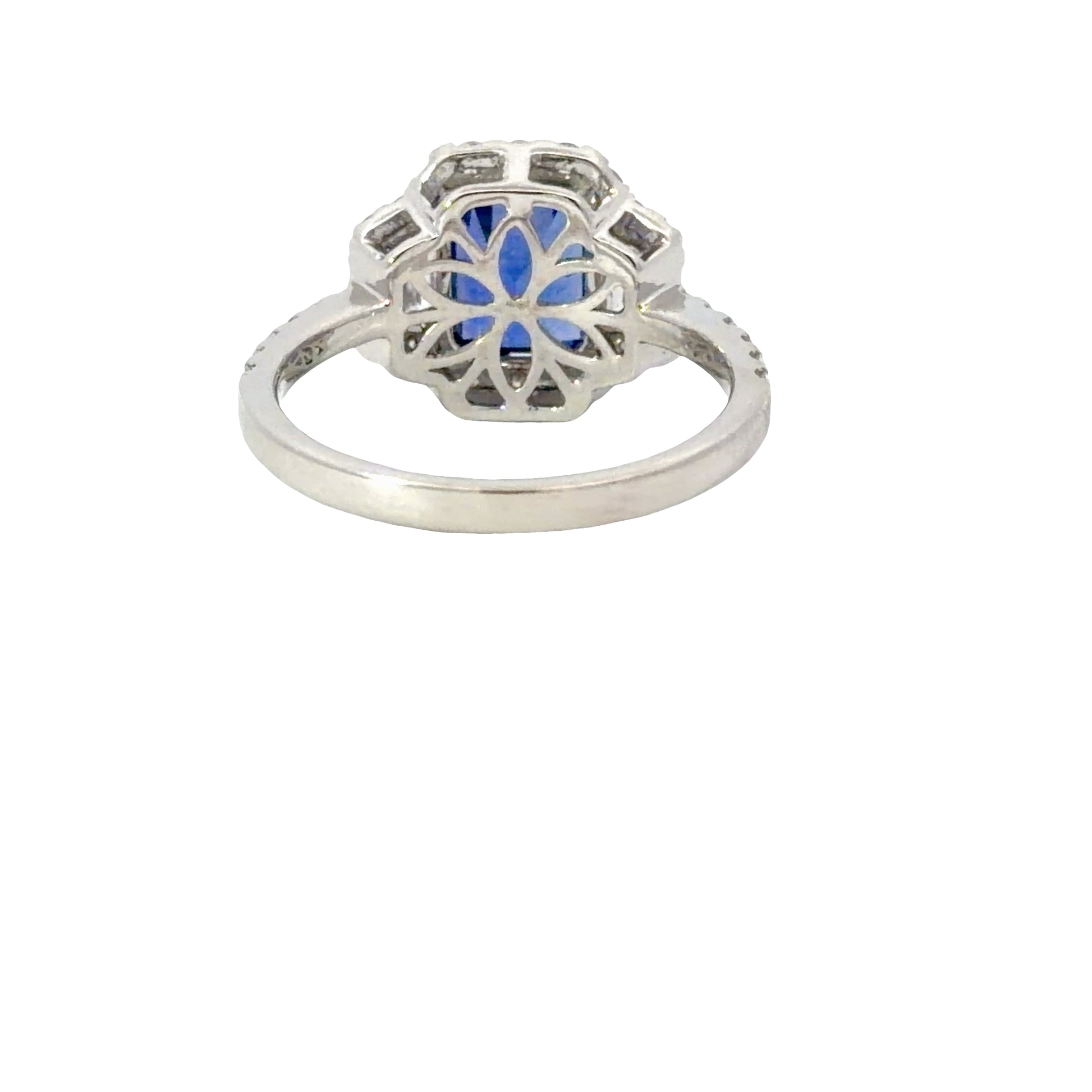 A sophisticated 18K white gold ring featuring a central Natural GIA emerald-cut royal blue sapphire 2.58 carats in a step-cut style. The center stone is flanked by two natural Trapezoids diamonds totaling 0.46 carats and encased in a brilliant round-cut diamond halo totaling 0.51 carats. The sparkling diamonds extend onto the polished band, creating a high-clarity magnificent design with exceptional symmetry and polish.