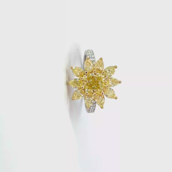 Indulge in the radiant allure of this exquisite cocktail ring, meticulously crafted in warm 18K white and yellow gold. The centerpiece showcases a stunning, Gia Natural Cushion cut fancy yellow diamond VS1 clarity weighing total 2.02 carats, set with Natural Fancy yellow Pear shapes diamonds total weight 2.21 carats and natural round white diamonds totaling 0.22 carats, radiating brilliance and fire. This statement piece exudes sophistication and makes a bold declaration of style.