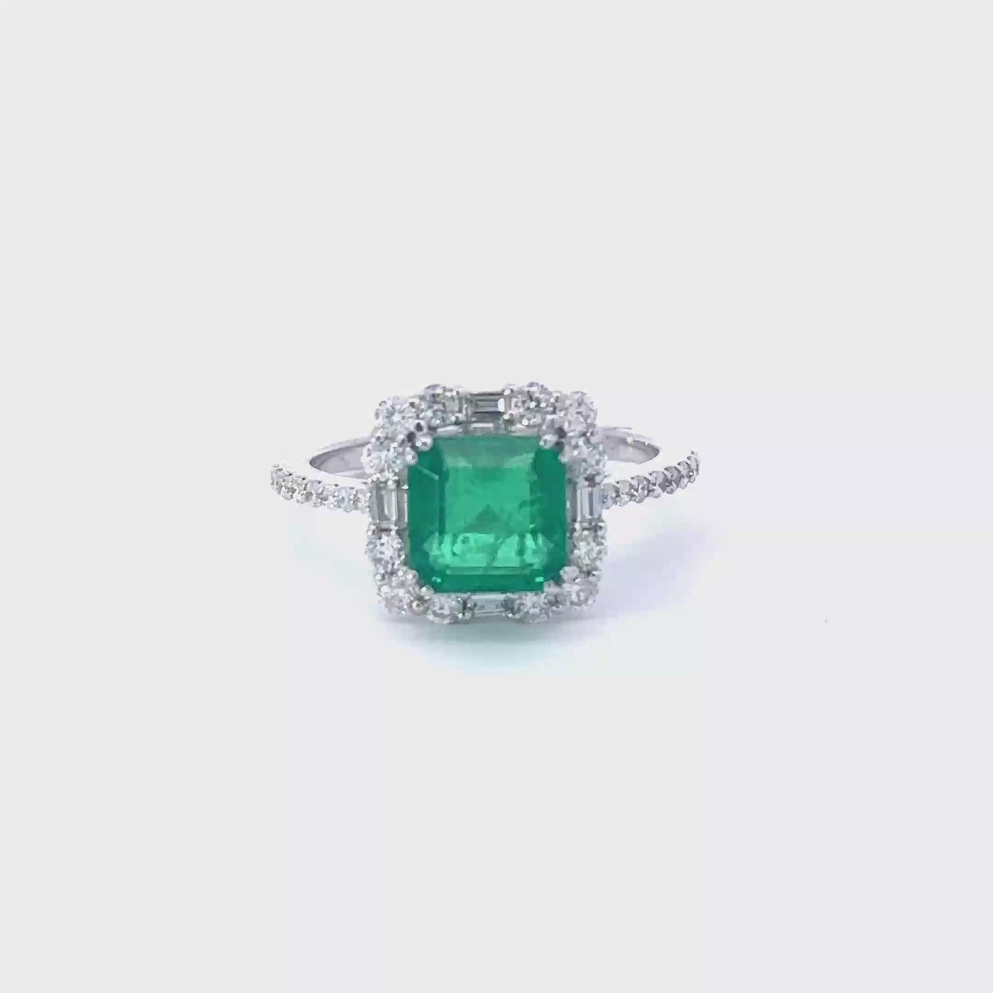 Set in 14k white gold with natural green emerald weighing total 2.06ct set with natural round and baguette diamonds total 0.74ct halo and along the shank of the ring.