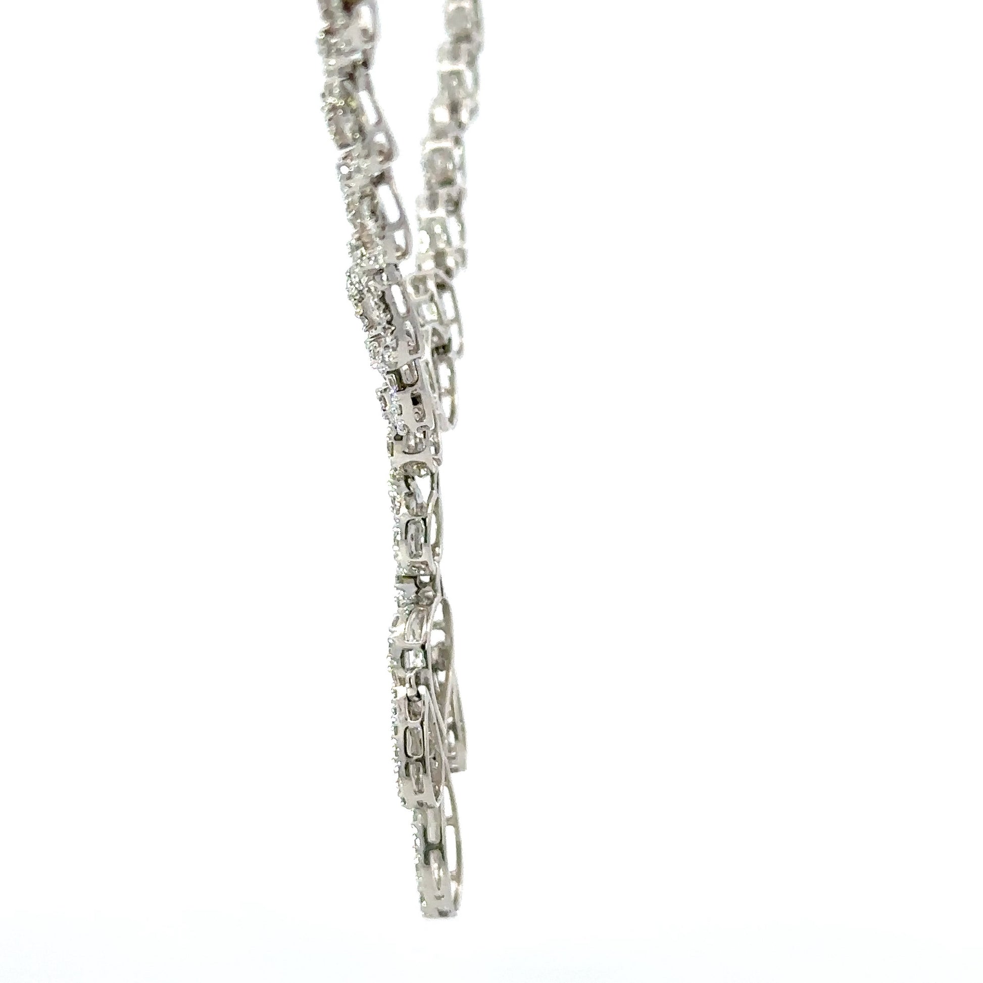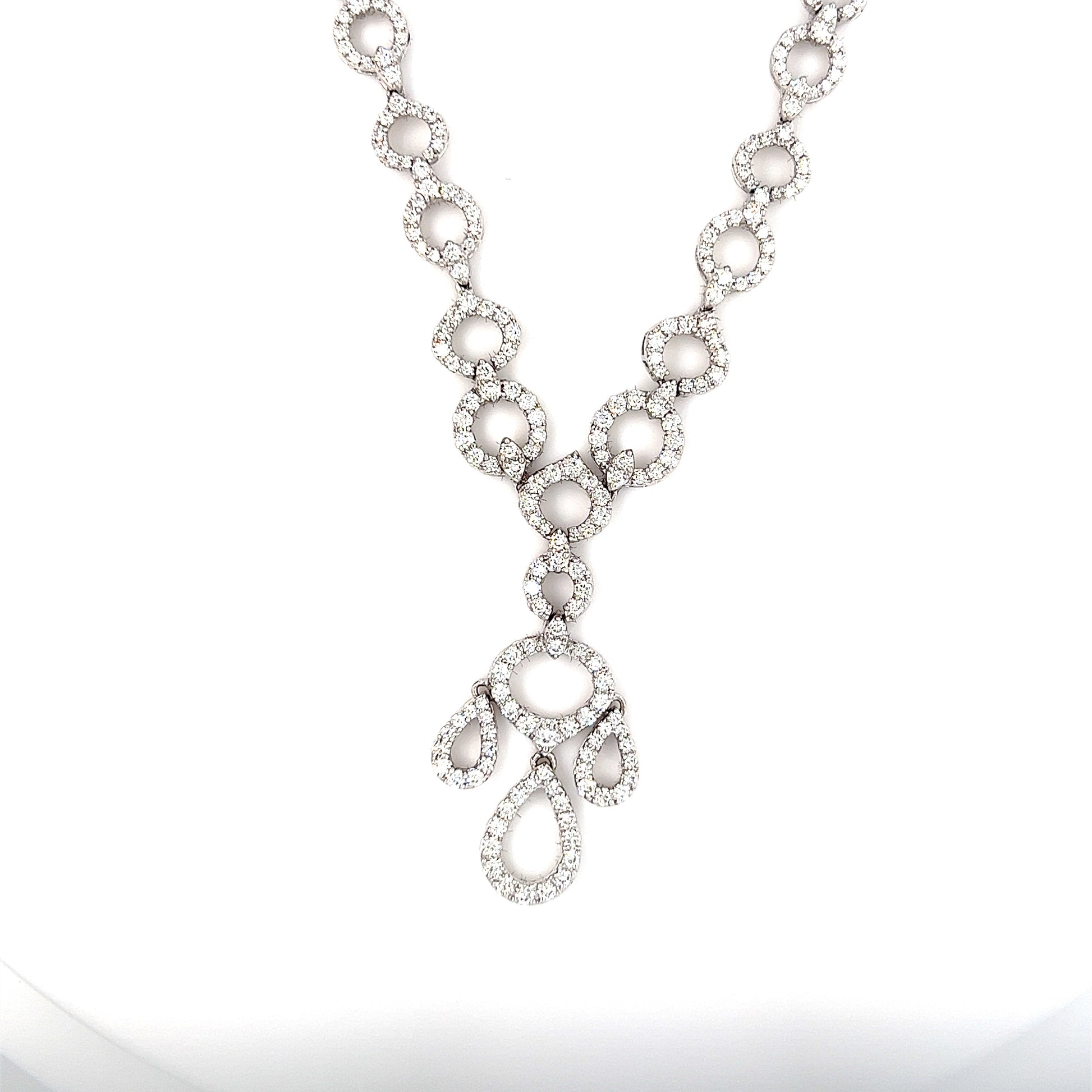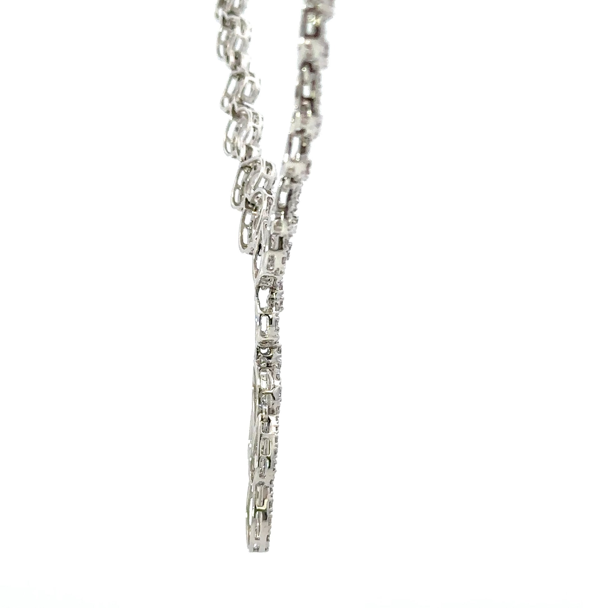 This exquisite diamond necklace features a unique design set with a 3.29ct diamonds of G color and VS clarity. The chain is made of 18k white gold and can be customized to different lengths.