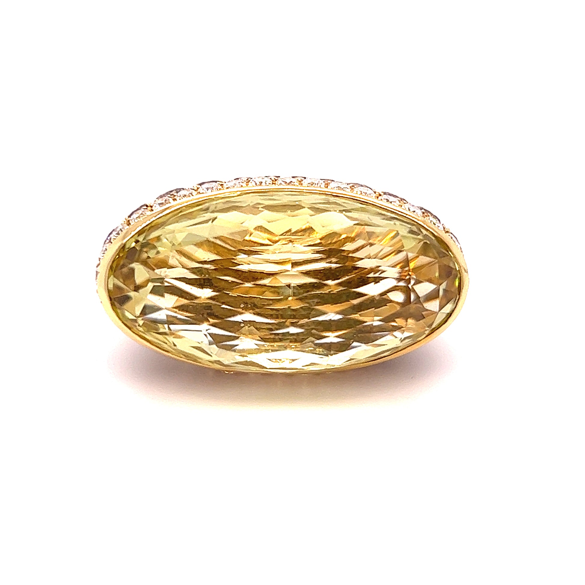 Lemon quartz is a stone known for its energy and healing properties. It is a stone of happiness and joy, and is believed to remove negativity and bad energy. This ring is adorned with an 18k yellow gold band and set with a natural lemon quartz center stone 26.81ct. Set with white diamonds weighing .74ct and champagne diamonds weighing 3.74ct.